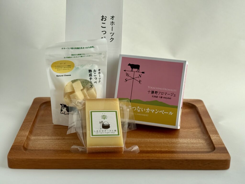 左からおこっぺ熟成チーズ(ゴーダ)、しあわせチーズ工房の幸、十勝野フロマージュなかさつないカマンベール