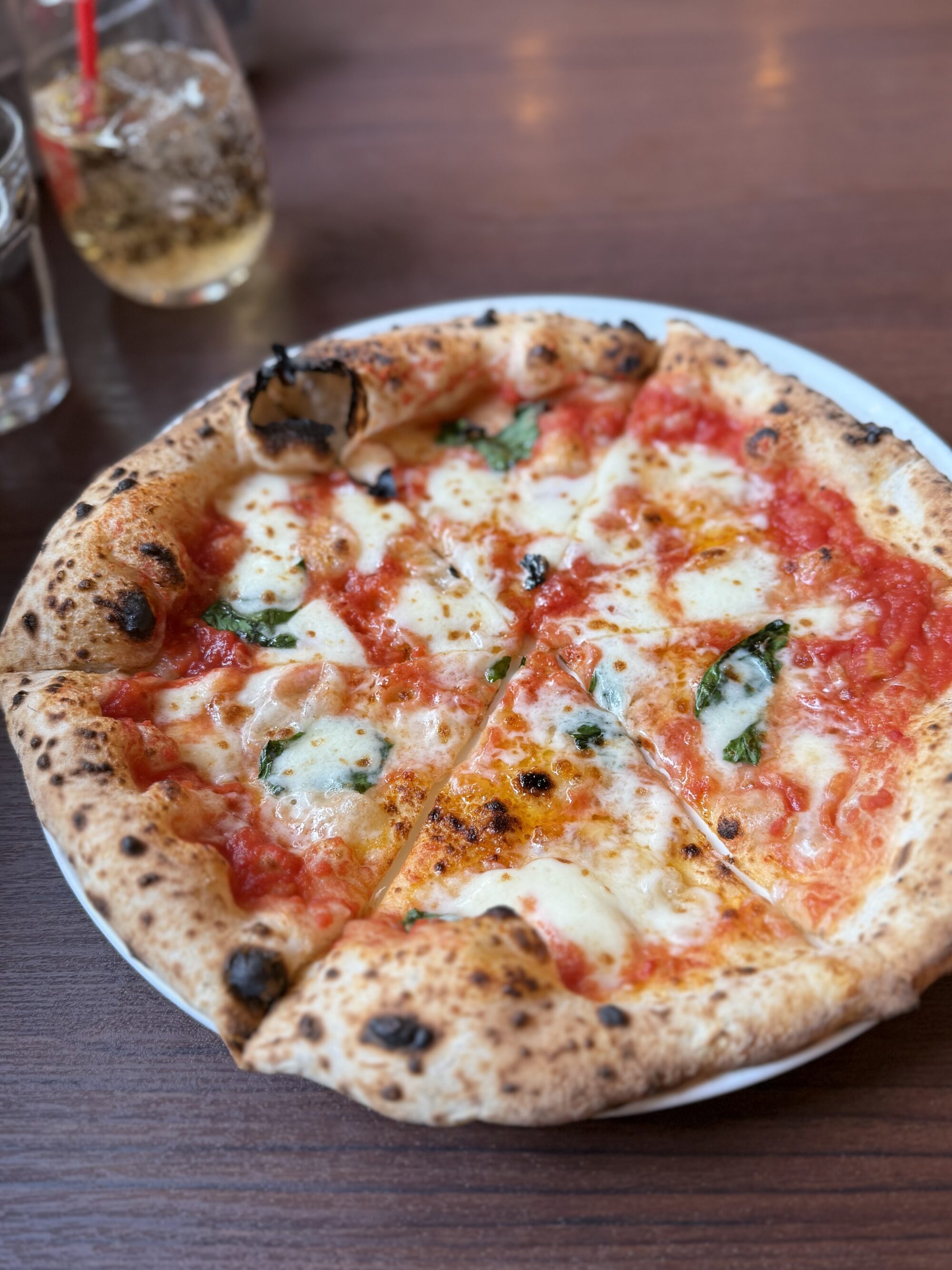 薪窯で一気に焼き上げるピザは、生地がモチモチとしていて本当に香ばしく、とろけるモッツァレラの濃厚なミルク感との相性が抜群でした。